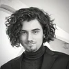 A man with curly hair and a slight smile sitting next to a white grand piano, looking into the camera.